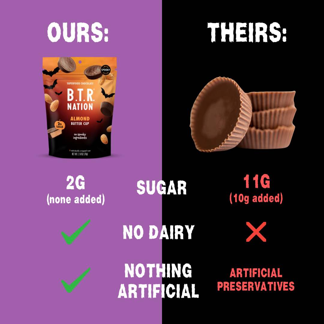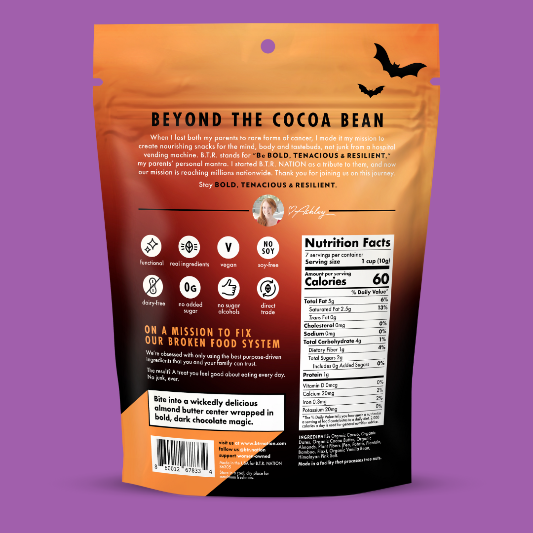 Our best-selling Dark Chocolate Almond Butter Cups just got a festive new look—perfect for trick-or-treating, Halloween parties, gifting, or keeping all to yourself. Wrapped in Halloween-themed packaging with bats, pumpkins, and no spooky ingredients, each cup is a guilt-free indulgence that’s scary good.