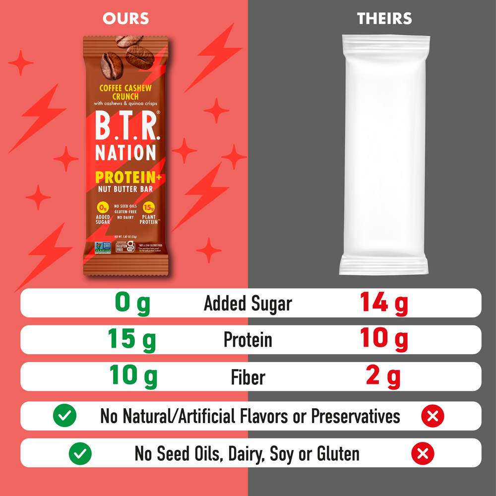 Here at B.T.R. NATION, one of our criteria is to always keep the sugar low with no added sugar where possible. That's why all B.T.R. NATION Bars have 0g added sugar and only 2-3g total sugar from nut butters, fruits, and seeds.