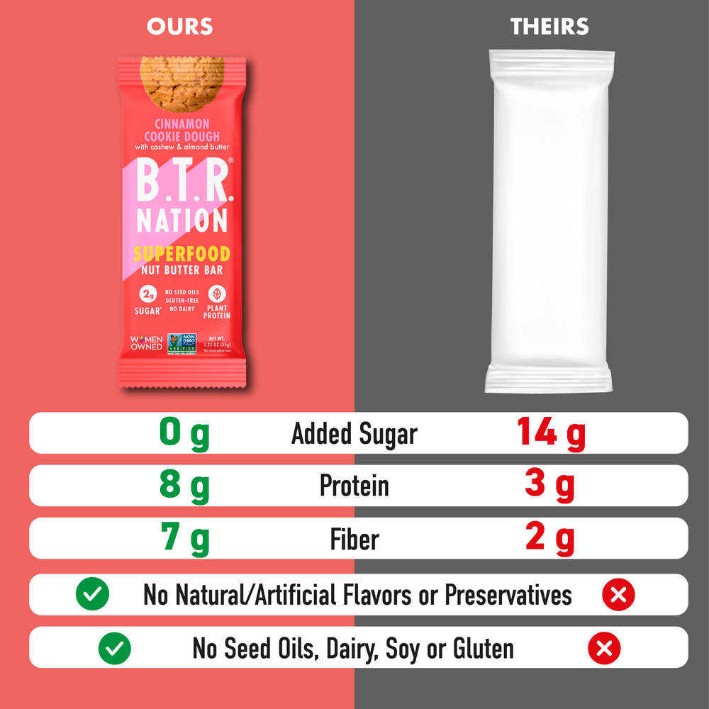 Here at B.T.R. NATION, one of our criteria is to always keep the sugar low with no added sugar where possible. That's why all B.T.R. NATION Bars have 0g added sugar and only 2-3g total sugar from nut butters, fruits, and seeds.