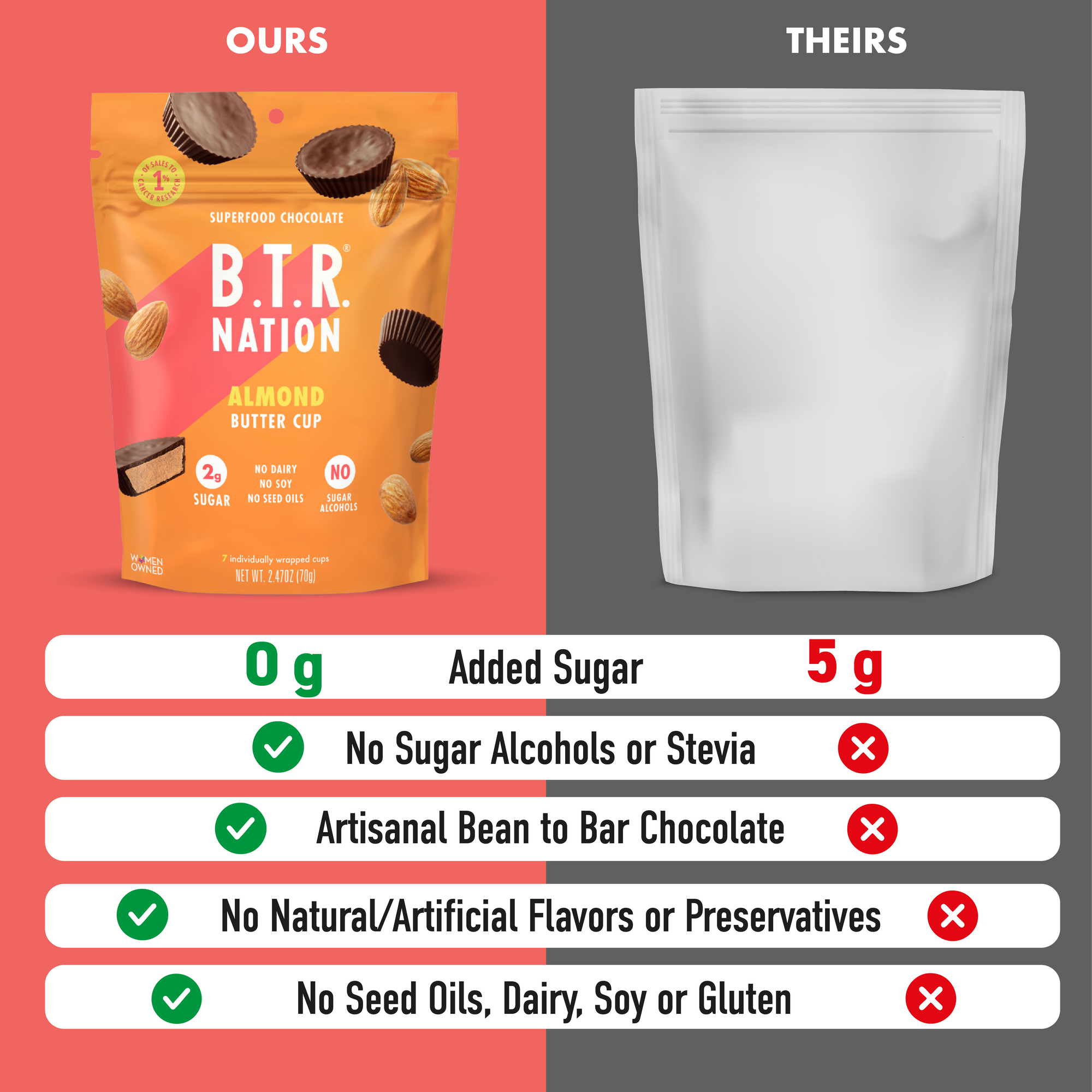 Here at B.T.R. NATION, one of our criteria is to always keep the sugar low with no added sugar where possible. That's why all B.T.R. NATION Bars have 0g added sugar and only 2-3g total sugar from nut butters, fruits, and seeds.
